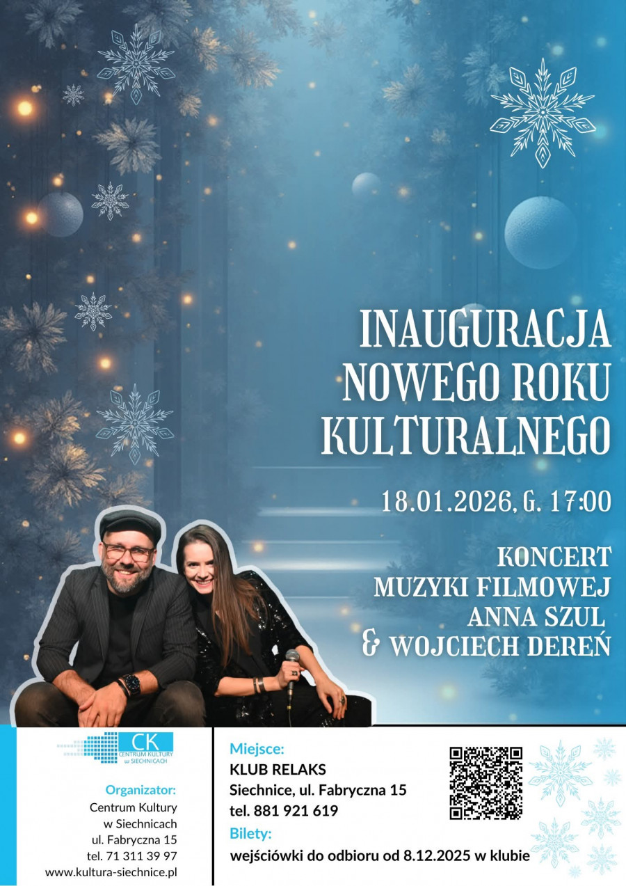 Podczas wydarzenia usłyszymy koncert muzyki filmowej w wykonaniu znakomitych artystów: Anny Szul oraz Wojciecha Derenia. To doskonała okazja, by rozpocząć nowy rok kulturalny w wyjątkowej, muzycznej atmosferze.