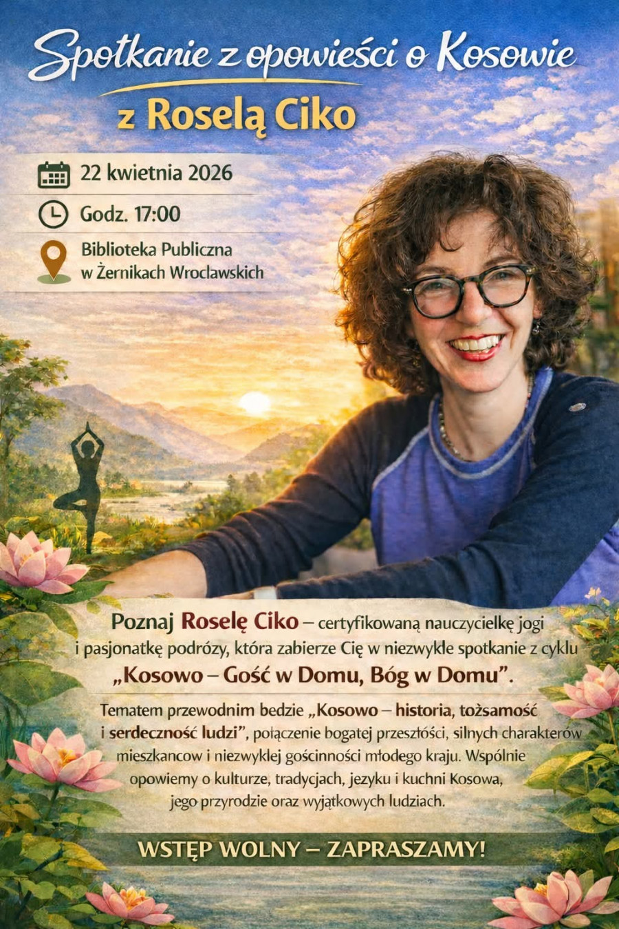 Wydarzenie organizowane jest w ramach cyklu "Kosowo – Gość w Domu, Bóg w Domu", a jego gościem będzie Rosela Ciko – certyfikowana nauczycielka jogi i pasjonatka podróży, która podzieli się swoimi doświadczeniami oraz wiedzą o tym wyjątkowym miejscu.