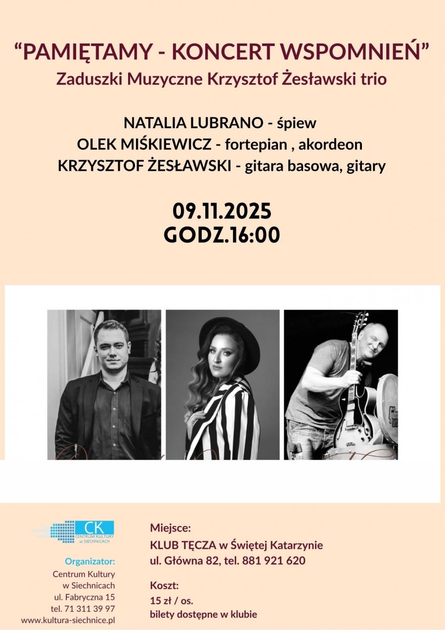 W programie znajdą się piosenki pełne wspomnień i poezji, w tym utwory inspirowane twórczością Agnieszki Osieckiej, której muzyczny świat Krzysztof Żesławski od lat z pasją popularyzuje. Zespół ma na koncie znakomity album "Osiecka Jazzowo", a Natalia Lubrano to laureatka Przeglądu Piosenki Aktorskiej we Wrocławiu.