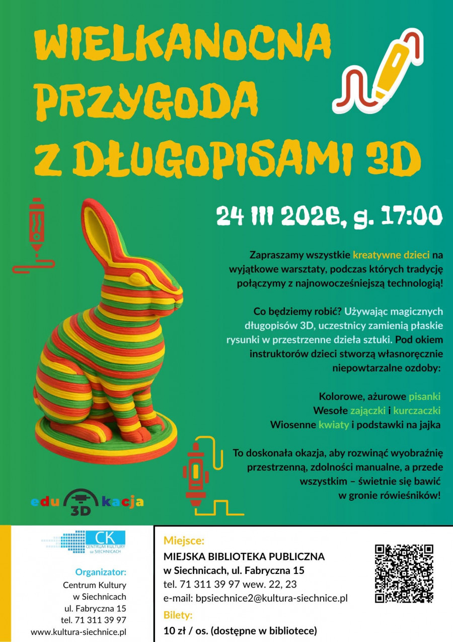Podczas warsztatów uczestnicy stworzą świąteczne dekoracje w zupełnie nowy sposób – przy użyciu długopisów 3D. Zamiast klasycznych pisanek i papierowych ozdób powstaną kolorowe, ażurowe formy, wiosenne kwiaty oraz oryginalne zajączki. Każde dziecko będzie mogło zabrać swoje prace do domu – jako dekorację świątecznego stołu lub wyjątkowy, własnoręcznie wykonany prezent dla bliskich.