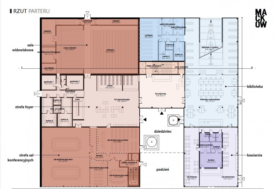 - wewnętrzny dziedziniec pełniący funkcję atrium.