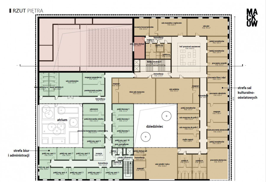 Na piętrze znajdą się m.in. pracownie plastyczne, muzyczne, filmowe, studio nagrań, sala tańca oraz przestrzenie edukacyjne.