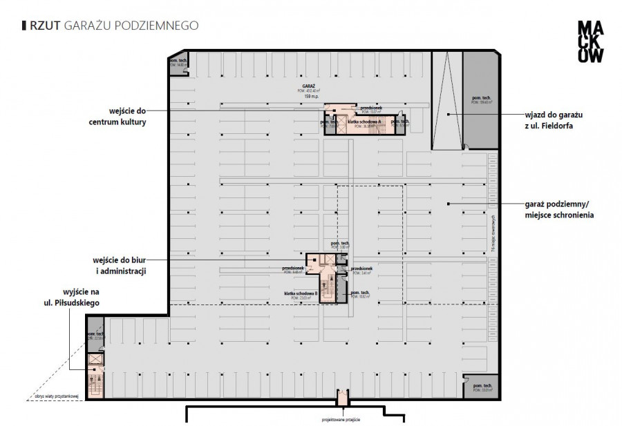 Pod budynkiem znajdzie się garaż podziemny, pełniący również funkcję miejsca doraźnego schronienia.