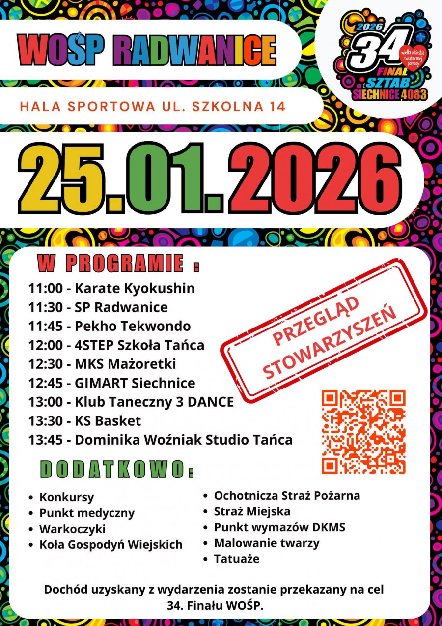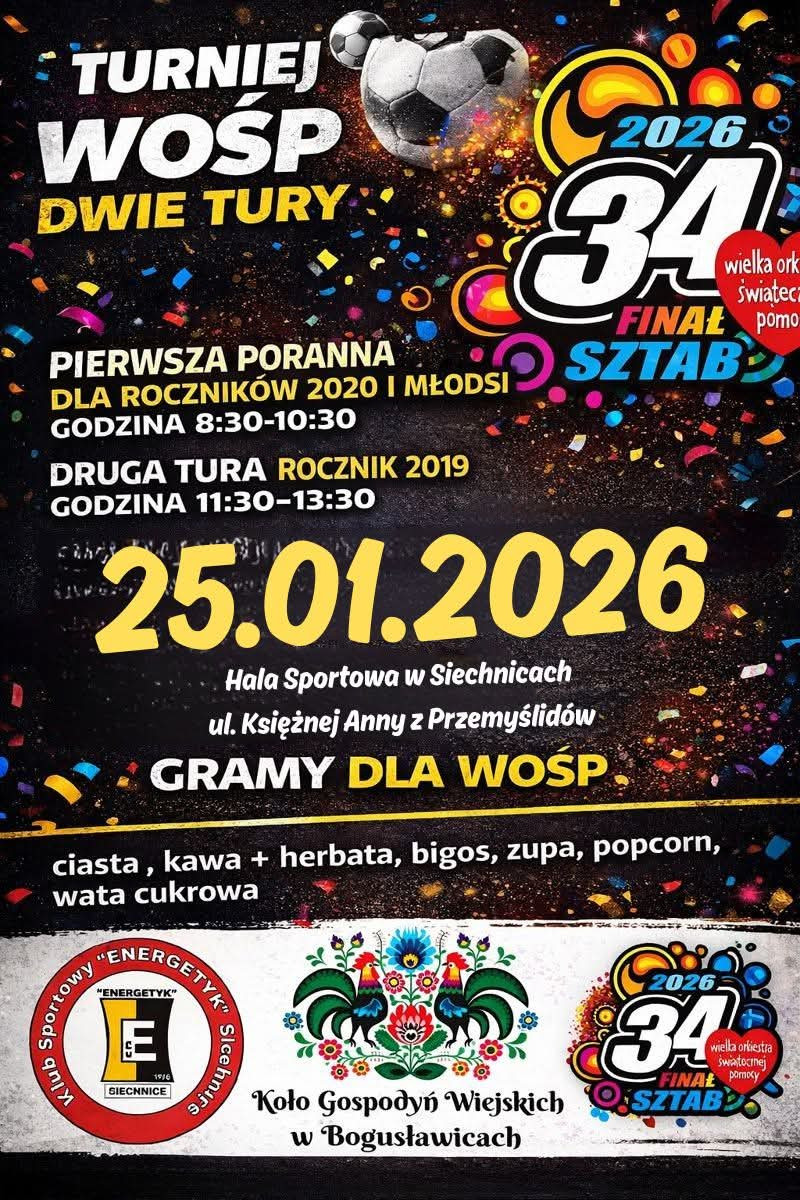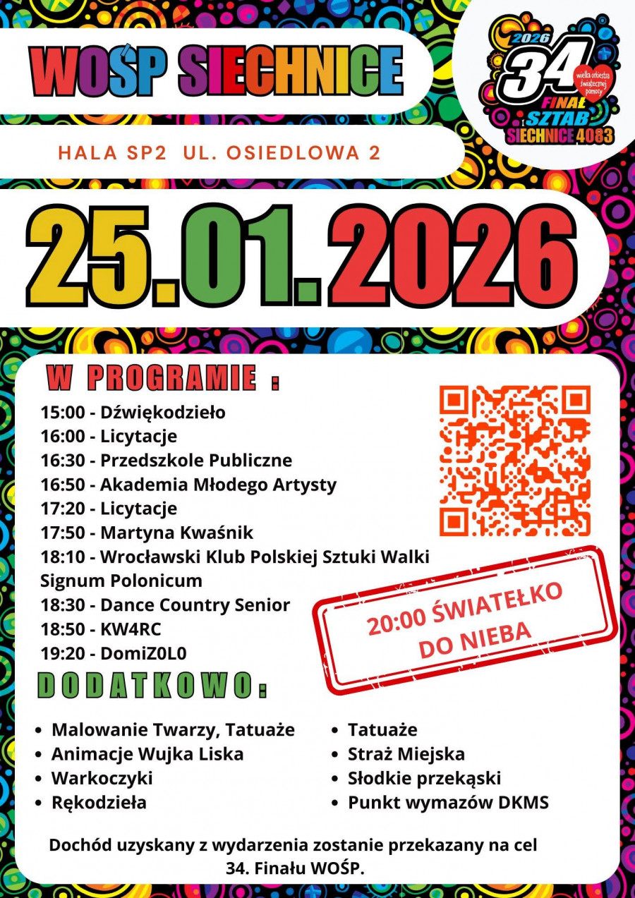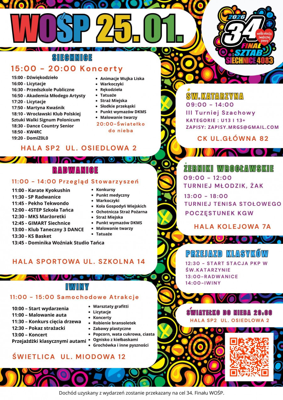 Na mieszkańców czekać będą liczne wydarzenia: koncerty, licytacje, występy artystyczne, atrakcje dla dzieci, stoiska lokalnych organizacji oraz oczywiście wolontariusze z charakterystycznymi puszkami i czerwonymi serduszkami. To doskonała okazja, by połączyć dobrą zabawę z pomaganiem. Szczegóły wydarzeń dostępne są na plakatach poniżej.