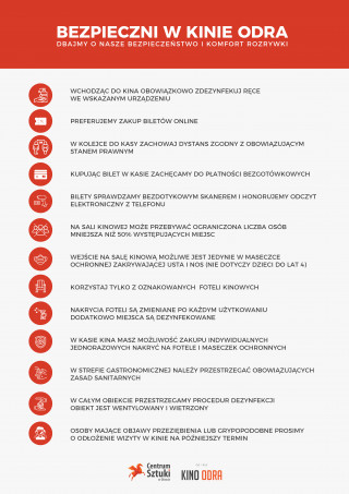Wchodząc do kina prosimy o dezynfekcję rąk przy wejściu, w specjalnym, bezdotykowym urządzeniu. Szczególnie zachęcamy do zakupu biletów on-line, honorujemy odczyt elektroniczny z telefonu! W przypadku zakupu biletu w kasie, stojąc w kolejce prosimy o zachowanie bezpiecznej odległości, tak jak w innych miejscach usługowych i handlowych. Bilety przy wejściu na salę kinową będą sprawdzane bezdotykowo skanerem.